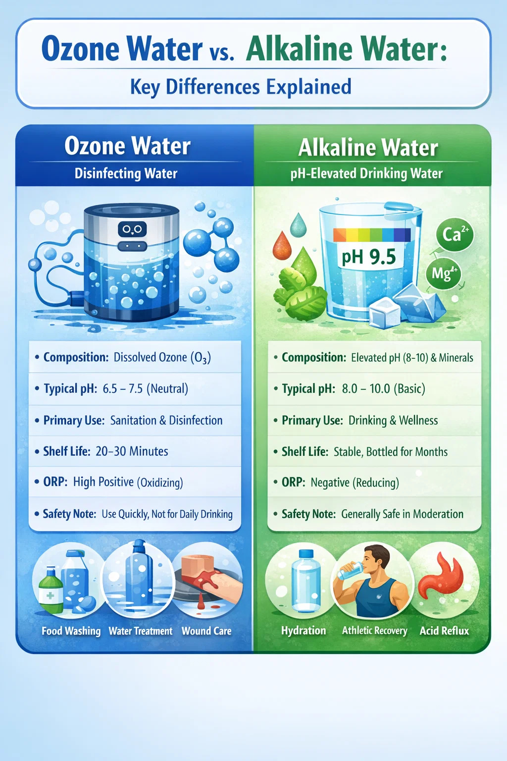 L’eau ozonisée et l’eau alcaline sont des produits distincts avec des compositions chimiques différentes, des applications différentes et des bases de données différentes. L'eau ozonisée est un désinfectant puissant et de courte durée, mieux utilisé pour les tâches d'assainissement : laver les aliments, traiter les surfaces et purifier l'eau. L'eau alcaline est un produit d'eau potable au pH élevé dont les avantages modestes et encore controversés liés à l'hydratation et à la gestion du reflux acide.
