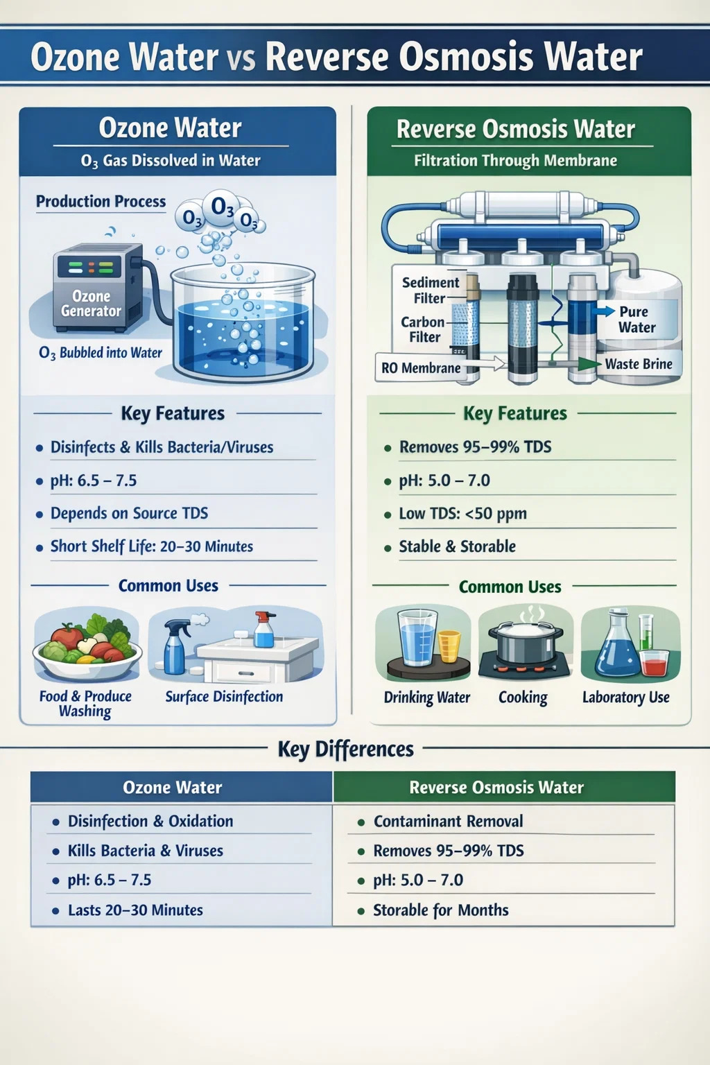 L’eau ozonisée et l’eau osmosée inverse ne sont pas identiques et ne sont pas interchangeables. L'eau ozonisée est de l'eau utilisée comme désinfectant actif ; L’eau RO est de l’eau dont les contaminants ont été physiquement éliminés. Le premier fonctionne grâce à la chimie – oxydation et destruction microbienne. La seconde fonctionne grâce à la physique – filtration sous pression à l’échelle moléculaire.