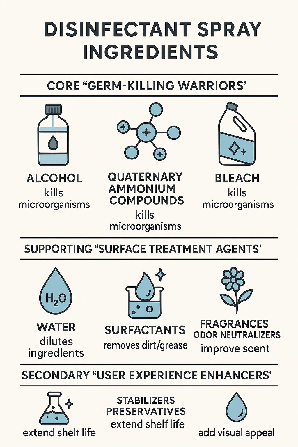 Pour créer un efficace spray désinfectant , les principaux ingrédients du « héros » peuvent être globalement classés comme suit :