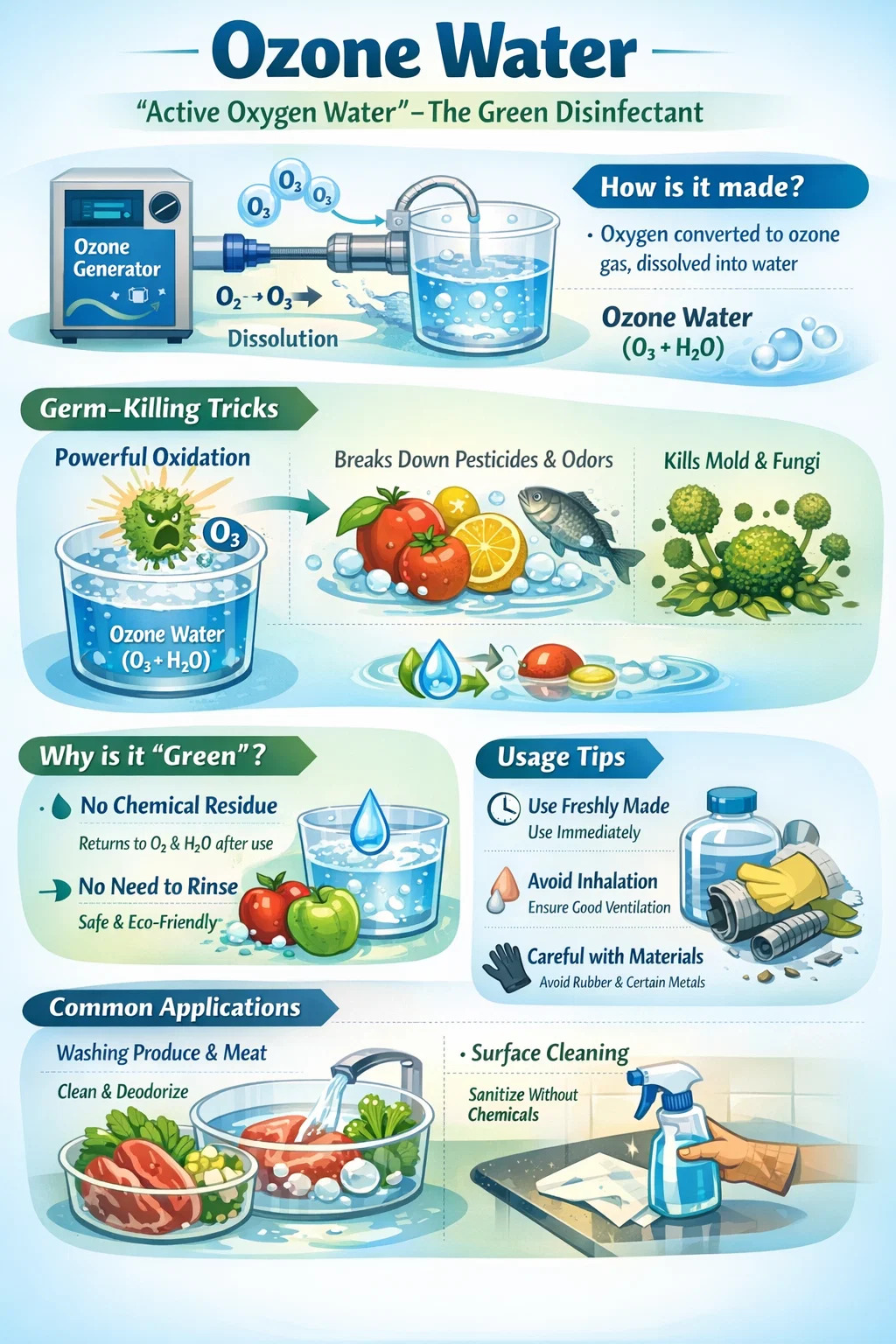 Zéro résidu chimique : c’est le plus grand avantage de l’eau ozonisée. Les désinfectants chimiques ordinaires peuvent laisser des odeurs âcres ou des résidus chimiques après utilisation, mais l'eau ozonisée redevient rapidement de l'oxygène et de l'eau ordinaires une fois sa tâche terminée.
